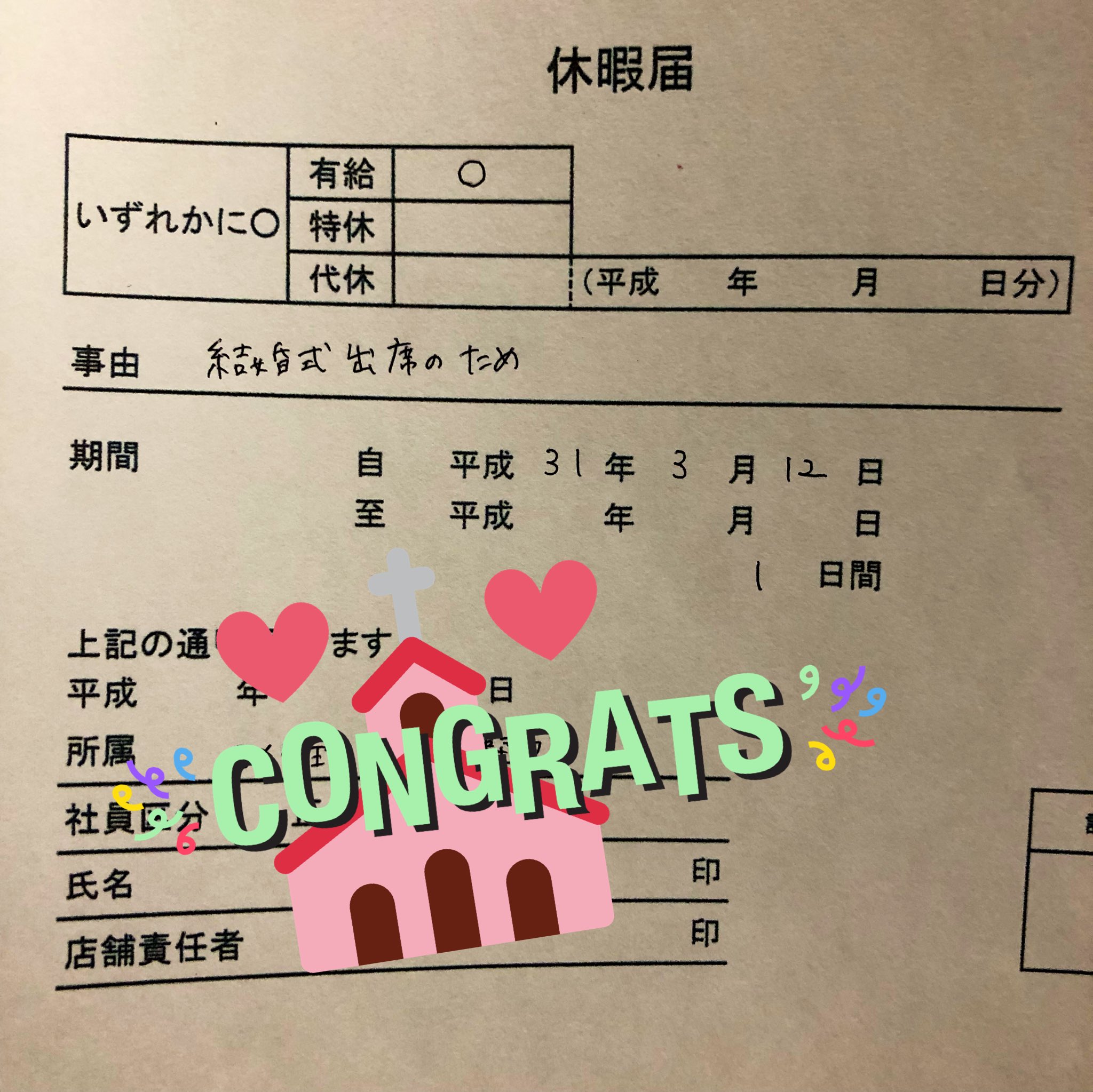 Sara 今月中に有給たくさん使わないと月末で無くなるって今日上司に言われたので 12日お休みしたの 休暇届出すことに ライブでも遠征でも理由何でもいいと言われたので 緩い そしておたくがバレてる 結婚式出席のため 嘘じゃないし 証拠
